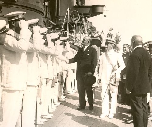 Sul ponte del Trento, Costanzo Ciano passa in rassegna gli ufficiali schierati e stringe la mano ad uno di loro. La nave sembra sostanzialmente completata.
