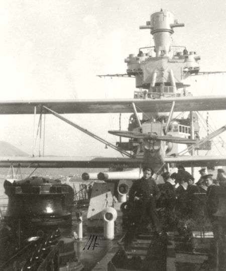 MiscellaneousImmagine 7 di 17<< Indietro - Back............................................................................................... Avanti - Forward >> Esci dalla Photo Gallery - Exit Sulla prora del Trento, con l'idrovolante degli anni trenta (coll.Melotto).