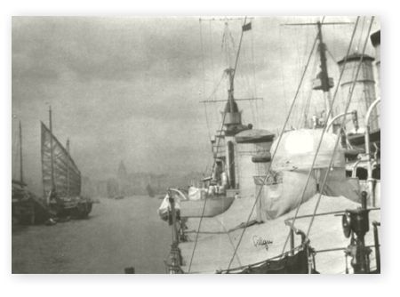 Navi in CinaImmagine 25 di 30<< Indietro - Back............................................................................................... Avanti - Forward >> Esci dalla Photo Gallery - Exit Alla fonda tra le giunche con il profilo di Shanghai nella foschia. Espero e Libia. Dalla Collezione Caligaris.