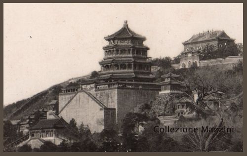 La monumentale Pagoda dell'incenso di Budda (Foxiangge) sulla Collina della longevità. Dietro, sulla sommità il Tempio di Sumeru (Xumilingjing).