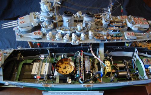 Il ponte centrale viene rimosso per la manutenzione. Si vedono (da destra): le batterie, la cavità per il fumo, la parte elettronica, i motori delle eliche.