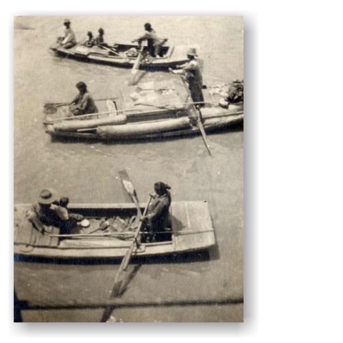 Yang-tze presso Shanghai. Intorno alla nave si vedono alcune barche cinesi a remi. Le navi occidentali erano costantemente affiancate da natanti di ogni genere, che avevano lo scopo di offrire servizi e merci.