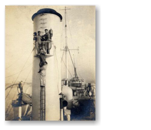 Cina - AlbertiImmagine 6 di 30<< Indietro - Back............................................................................................... Avanti - Forward >> Esci dalla Photo Gallery - Exit Marinai arrampicati sul fumaiolo della Caboto. "In parata".