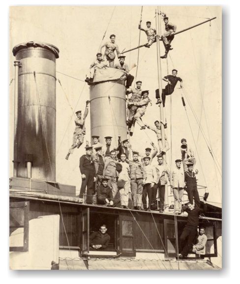 Equipaggio della cannoniera Carlotto, in posa arrampicato sulle sovrastrutture e fumaioli, imitando la tradizione della foto di gruppo navale. Foto probabilmente scattata durante la permanenza in bacino per manutenzione.