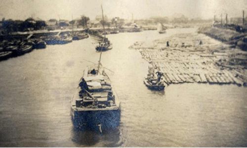 Fiume Pey-ho, probabilmente vicino a Tientsin. Potrebbe anche essere la Banchina d'Italia, sulla destra sarebbe la Concessione italiana. Traffico fluviale e legname.