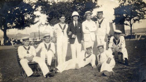 Immagine che riassume aspetti della vita occidentale nella colonia cinese: la libera uscita, la frequentazione di spazi e giardini riservati agli stranieri, l'amicizia con civili e altro personale residente, relax ma sempre con aspetto curato.