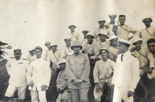 Escursione di ufficiali e marinai con un personaggio, un ufficiale in tenuta coloniale che non conosciamo e che forse fa da guida. La nota aggiunta sul retro parla di un missionario.